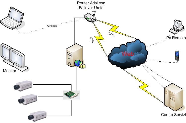 - Se, a causa di un guasto o di un sabotaggio, il sistema perde il collegamento primario ad Internet, il Router/FIrewall installato si collega automaticamente ad Internet via GSM/GPRS/UMTS e notifica, se richiesto, il Cliente del guasto per metterlo in condizione di verificare la situazione e prevenire azioni criminose